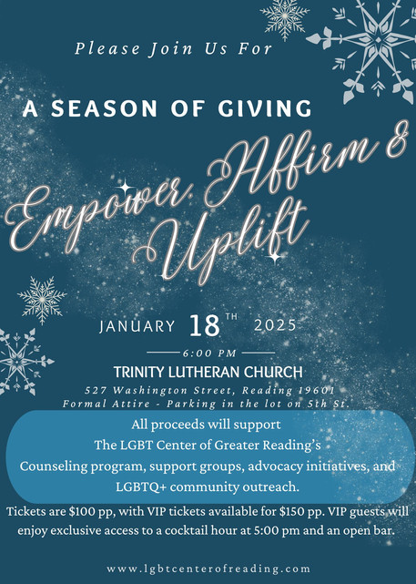 We are THRILLED to announce our Winter Fundraising Gala in January 2025! All proceeds will support the LGBT Center of Greater Reading's Counseling programs, support groups, advocacy initiatives, and LGBTQ+ community outreach.